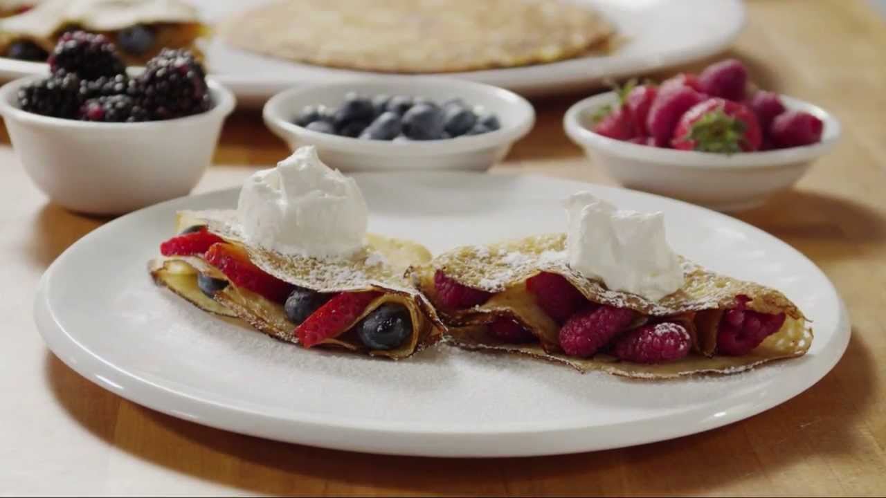 Watch how to make wonderfully fluffy crepes flavored with a touch of vanilla extract. Roll them with fresh berries and top with fresh whipped cream and a sprinkle of powdered sugar. They smell heavenly as they cook.