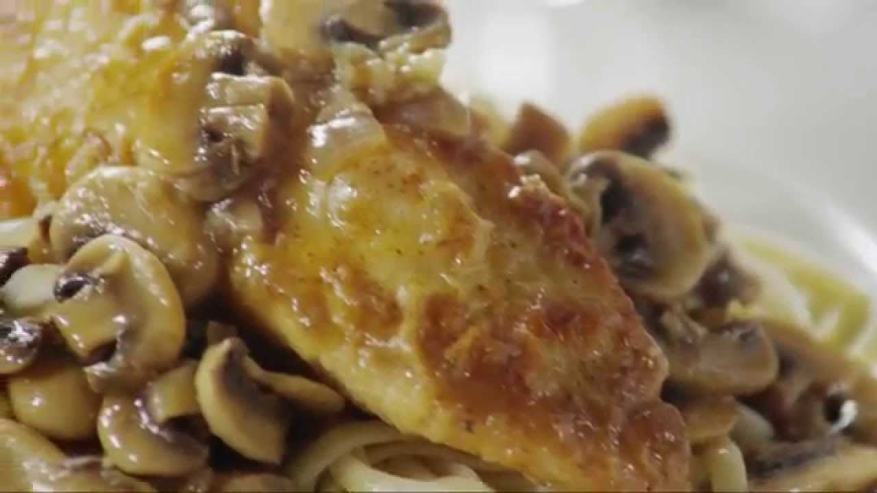 In this video, you’ll see how to make chicken piccata with sliced mushrooms. You’ll lightly coat boneless chicken breasts with seasoned flour and sautée them with mushrooms and onions, finishing them with a gentle simmer in a light white wine sauce. Garnish with chopped Italian parsley and serve with pasta or rice.