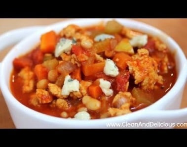 PRINT THE RECIPE FOR BUFFALO CHICKEN CHILI HERE: http://cleananddelicious.com/2014/01/27/clean-eating-buffalo-chicken-chili-video/