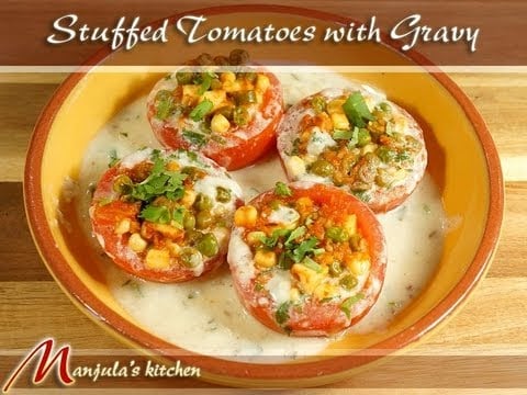 Stuffed Tomatoes with Gravy Recipe by Manjula View full recipe at http://www.manjulaskitchen.com/2013/08/08/stuffed-tomatoes-with-gravy/ If you love Indian vegetarian cooking and wish you knew how to create magnificent dishes for your friends …