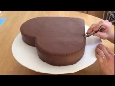 I used a round and square cake to make a heart, covered the whole thing with chocolate rolled fondant (http://amzn.to/1B1wJK7), and used a small heart-shaped crimping tool (http://amzn.to/19bHgGC) to add …