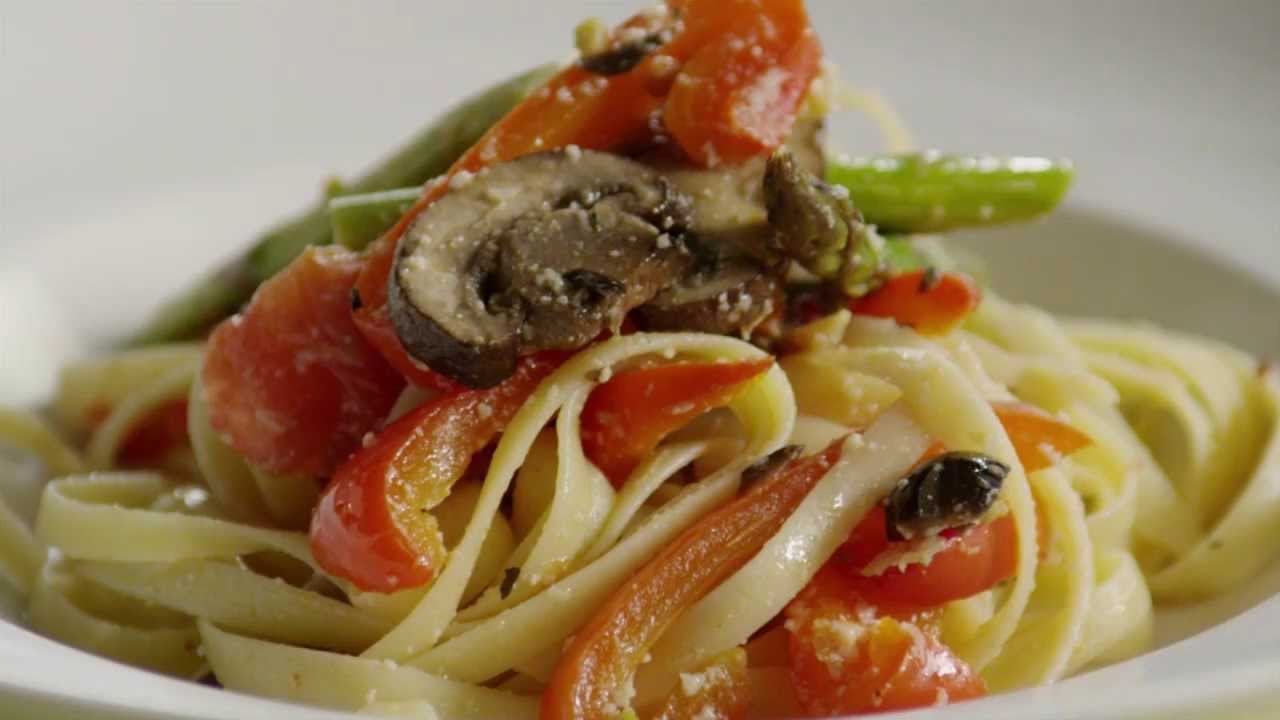 Watch how to make a healthy vegetarian pasta loaded with asparagus, mushrooms, bell peppers, tomatoes, and roasted garlic. Fresh herbs and a quick tapenade add extra flavor to this rustic, Italian-inspired main dish.