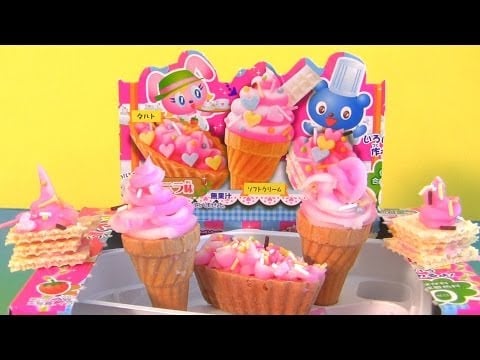 The Kracie Popin’ Cookin’ cake shop edible ice cream candy making kit is fantastic. Making candy at home has never been easier and more fun. The Kracie DIY food kit toy also includes a fork for stirring the candy mixture as well as gummy candy powder which looks like beach sand, and two candy sachets colored powder, plus 2 ice cream cones, 2 wafers and wafer tray. Using these colours, you get to make your own gummy color flavours and start creating your own edible gummy candy artwork!!! Directly from gummy land Japan, Kracie is a Japanese candy that created Happy Kitchen. Happy Kitchen is a series of candies that represent real human food, but smaller and some are more sweet than savory. The concept behind Popin’ Cookin’ is to put various powders into a tray and just add water! There are many kits with different themes such as cupcakes, animals, ice cream, sushi, cakes and donuts. This gummy candy is edible after it sets. So have fun cooking with these do-it-yourself candy making kits.