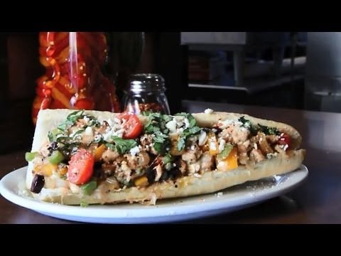 In this video, you’ll see how to make a chicken sandwich that’s loaded with the flavors of the Mediterranean. Tender strips of chicken and veggies are piled high on a hoagie roll and topped with melted mozzarella and feta cheese.