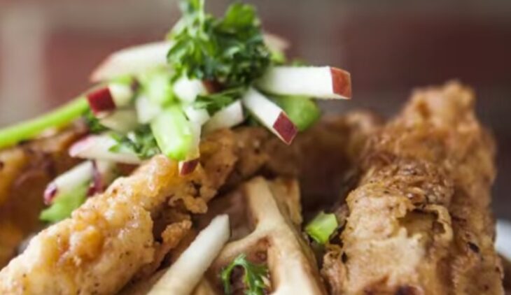 Taking what we thought to be the best bits from each, we came up with this… a savoury cheddar and bacon waffle, with crispy Cajun fried chicken goujons and an apple and celery slaw… finished with maple syrup of course!